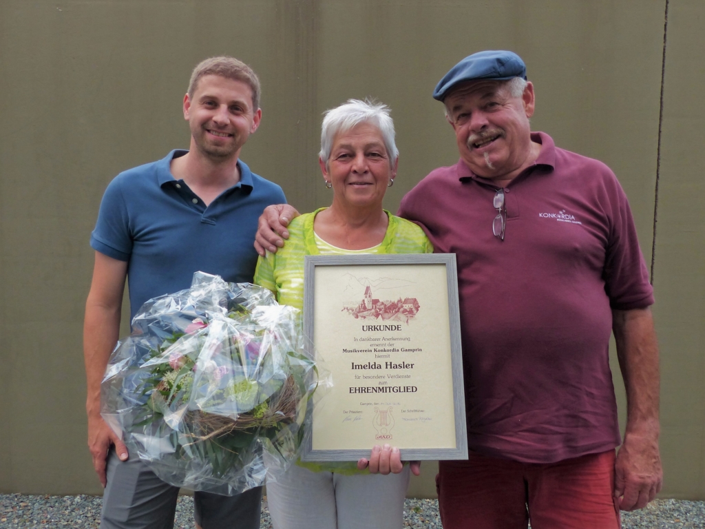 Ein Musiklager ohne Imelda – das können wir uns in Gamprin gar nicht mehr vorstellen. Schon seit Wilfried sie vor 28 Jahren rekrutiert hat, begleitet Imelda die Jugendmusik Gamprin jeden Sommer als Köchin und Lagermama ins Musiklager und sorgt nicht nur stets für volle Bäuche, sondern auch für gute Laune und wo nötig für tröstende Worte. Aber auch abseits der Musiklager hat Imelda den Musikverein über all die Jahre tatkräftig unterstützt. Für ihre ausserordentlichen und langjährigen Dienste dem Musikverein Gamprin gegenüber durften wir Imelda Hasler beim diesjährigen Lagerkonzert die Ehrenmitgliedschaft verleihen.